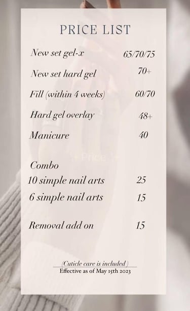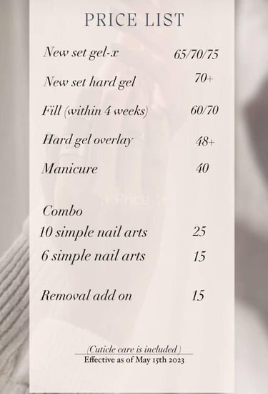 Beautiful nails for every style—choose from Gel-X, Hard Gel, classic Manicures, or natural overlays. Precise cuticle care and long-lasting finishes, tailored to your look.